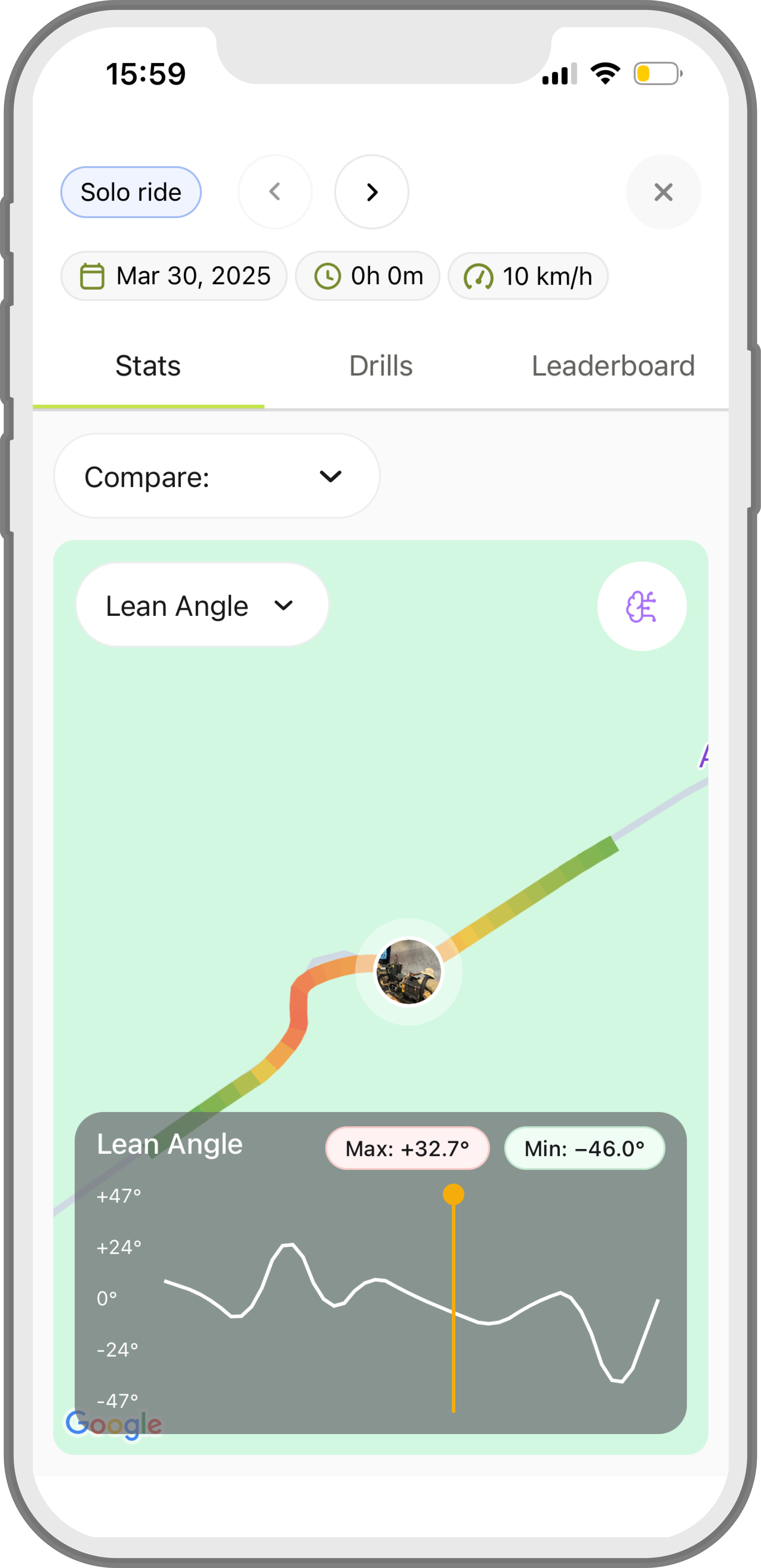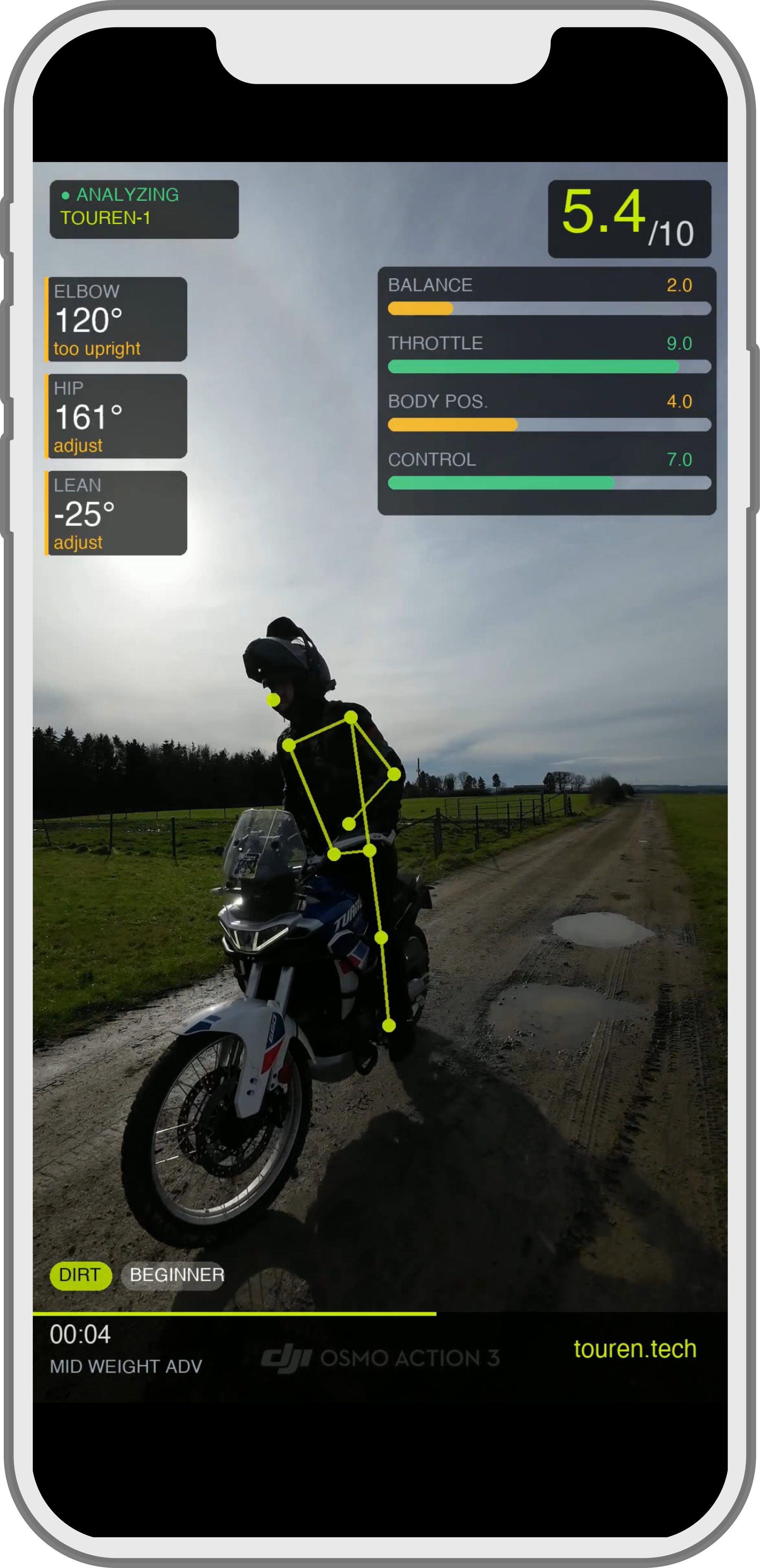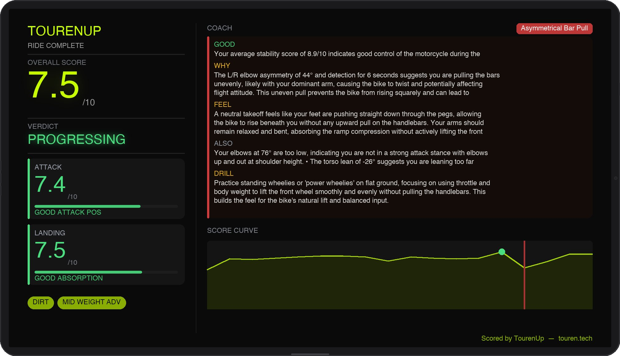 Your phone captures sensor data during every drill — balance, throttle smoothness, weight distribution, correction rate. Scored against thresholds calibrated for your bike class and terrain. Get instant feedback the moment your drill ends.