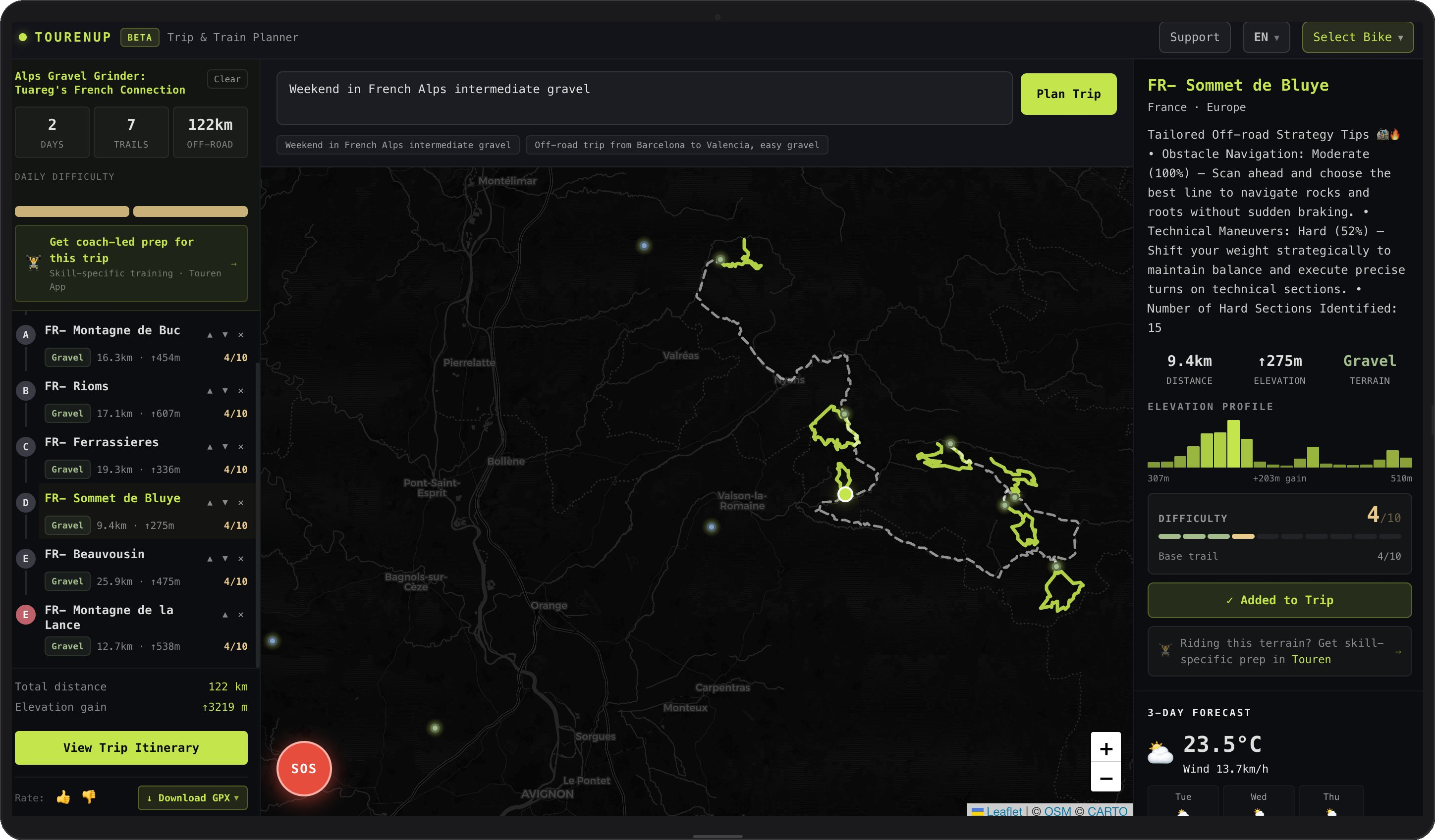 TourenUp's AI trip planner chains verified trails into a one-day or multi-day route, matched to your bike, your skill level, and the weather forecast. Ride the route in the app, and every section gets its own technique score. You don't just finish a ride — you finish knowing exactly where you were strong and where you weren't.